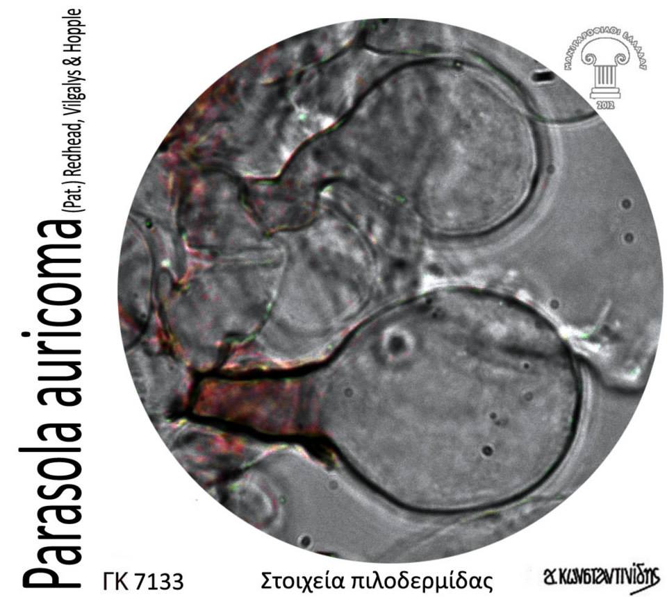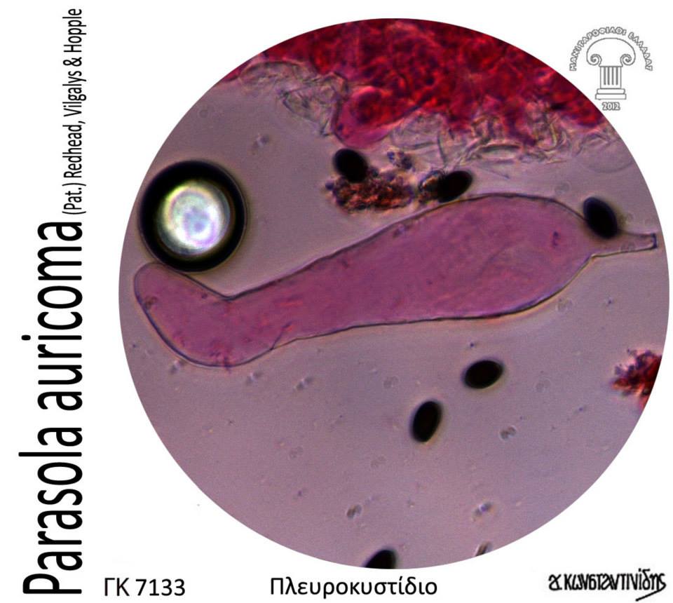 Το μάλλον συνηθισμένο, μη εδώδιμο Parasola auricoma (Pat.) Redhead, Vilgalys & Hopple (=Coprinus auricomus Pat., Coprinus hansenii J.E. Lange) (BΚ4/266, FAN6/34, C5/1720, Co758, Mo267, Κ3-120, FN584, manitrai.gr) καρποφορεί από τον Απρίλιο έως τον Δεκέμβριο, μοναχικά ή κατά ομάδες, σε δάση, κήπους, πάρκα, όχθες χειμάρρων, άκρες δρόμων, λιβάδια και αλλού, σε υγρό έδαφος ή σε θαμμένο ξύλο και παράγει βασιδιώματα με κοκκινοκαφετί δίσκο, πτυχωτό καπέλο που αυτοδιαλύεται αργά ή καθόλου, λείο, λευκωπό ή καφεκιτρινωπό πόδι (3-12 x 0,2-0,4 εκ.) χωρίς πέπλο, χωρίς καυλοκυστίδια, ελλειπτικά-μακρόστενα βασιδιοσπόρια ((10) 12-14,5 (16,5) x (6) 6,5-7,5 (9,2) μm, Κ(1326): 12,5-15,5 x 6,5-9,3 μm, Κ(1903): 11-14 x 7,3-8,5 μm, Κ(1886): 11,3-13 x 5,8-8,7 μm, Κ(7133) : 10,85-15,1 x 6,9-9,2 μm, Q=1,35-2,05) με κεντρικό βλαστητικό πόρο, (2) 4-σπορα ροπαλόμορφα βασίδια χωρίς βασικό κρίκο, κυλινδρικά, ασκόμορφα ή λαγηνόμορφα χειλοκυστίδια (17-75 x 9-27 µm), παρόμοια αλλά μεγαλύτερα πλευροκυστίδια (70-130 x 19-35 µm) και πιλοδερμίδα από αχλαδόμορφα στοιχεία (30-55 x 19-33 μm) και σποραδικά, μακριά (200-400 x 7-11 μm) παχύτοιχα, καφετιά σκληροκυστίδια. Πηγή: Γιώργου Κωνσταντινίδη: Agaricales – Αγαρικοειδή (αδημοσίευτο αρχείο)