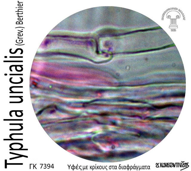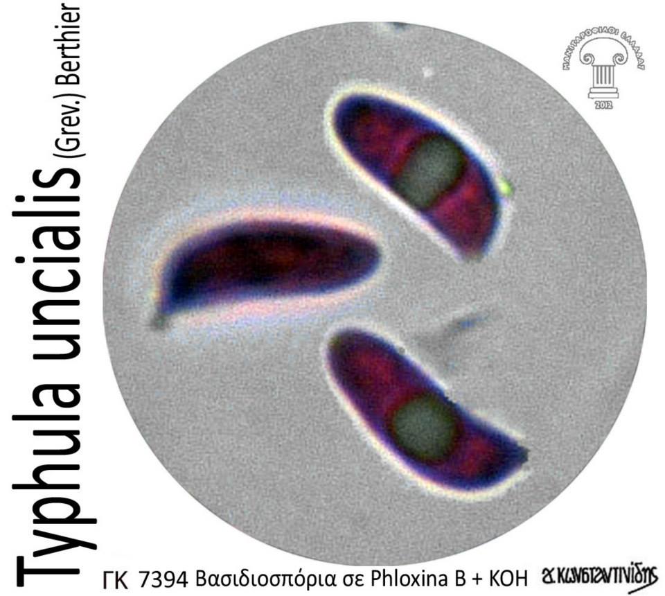 Εύρεση: Δ. Κλεισιάρη. Φωτογράφιση-ταυτοποίηση: Γ. Κωνσταντινίδης Το βρήκαμε σε έναν υπέροχο βιότοπο τον οποίο μας έδειξε η El Modo. Moni σ΄ευχαριστούμε! Το ασυνήθιστο Typhula uncialis (Grev.) Berthier (=Typhula falcata P. Karst. κ.ά.) (J92, ΕΕ212, Ν3-257, mycodb.fr, ΒΚ2-436, Andrzej Chlebicki (mycotaxon.com), ispotnature.org, wildaboutbritain.co.uk, ΑG15) καρποφορεί μοναχικά ή συνήθως κοπαδιαστά, καλοκαίρι και φθινόπωρο, σαπροτροφικά, σε σάπιους μίσχους φυτών (πετασίτη, χαιρόφυλλου, επιλόβιου, αγγελικής, βούρλου, φτέρης, γαϊδουράγκαθου, ακόνιτου, (κ.ά.) ως επί το πλείστον σε ορεινά και υπαλπικά οικοσυστήματα και παράγει πολύ μικρά, λευκά, συνεκτικά, ελαστικά, ευθεία ή ελαφρώς ελικοειδή βασιδιώματα συνολικού ύψους 3-5 (10) χιλ., με απλή, λεία, σφαιρική, αβγόμορφη, ροπαλόμορφη ή σπατουλόμορφη, λευκή (φρέσκο) έως κρεμ-κιτρινωπό (ξερό ή στην ωριμότητα) κεφαλή ( x 0,4-1,5 χιλ.), υαλώδες πόδι (x 0,2-0,4 χιλ.) χωρίς σκληρώτιο, λείο ή με λίγες υπανάπτικτες τριχούλες και κρυστάλλους, ελλειπτικά, λεία, μη αμυλώδη βασιδιοσπόρια ((5,5) 6-8 (9) x (2) 3-3,5 μm, Κ(7394): 6-9 (9,3) x 2,2-3,3 µm) με σταγόνες, 4-σπορα, ροπαλόμορφα βασίδια και υφές (Κ(7394): x 2,05-6,35 µm) με κρίκους και κρυστάλλους. Πηγή: Γιώργου Κωνσταντινίδη: Cantharelloid-Hydnoid- Clavarioid – Κανθαροειδή-Υδνοειδή-Κλαβαριοειδή (αδημοσίευτο αρχείο)