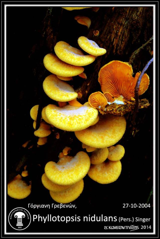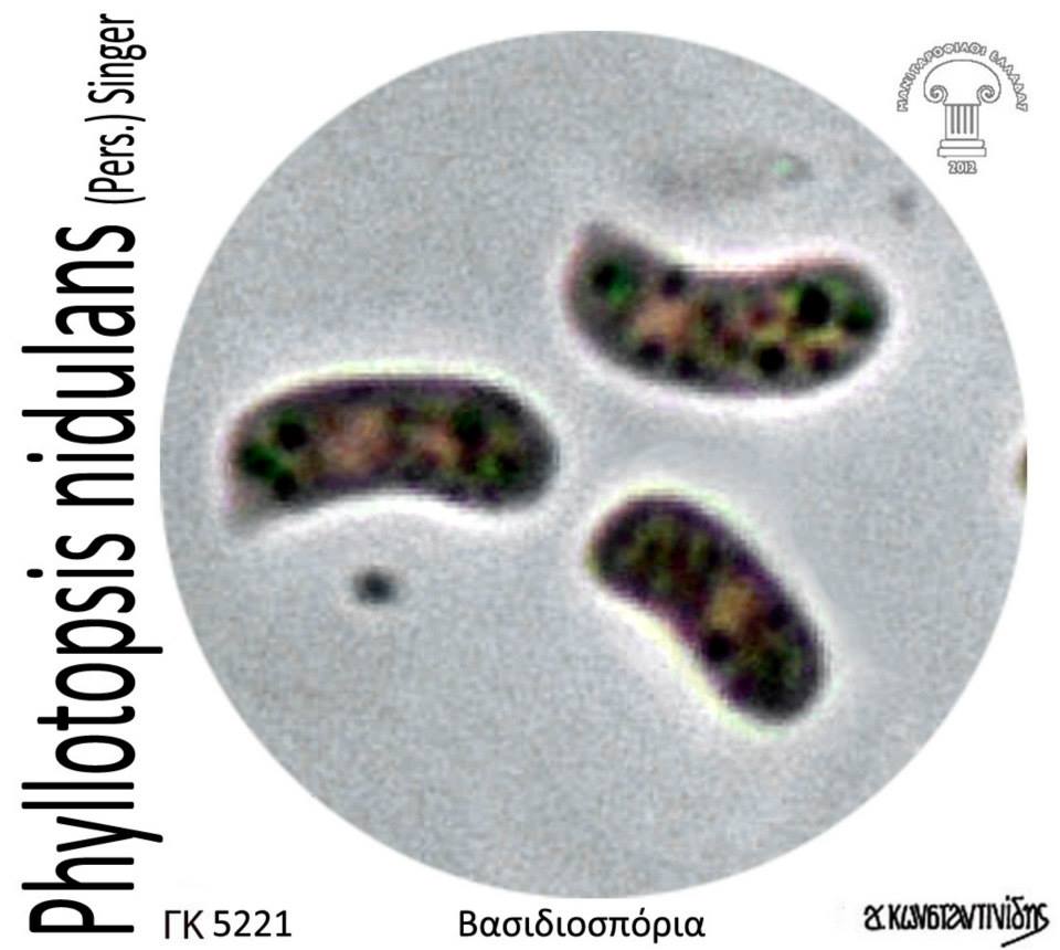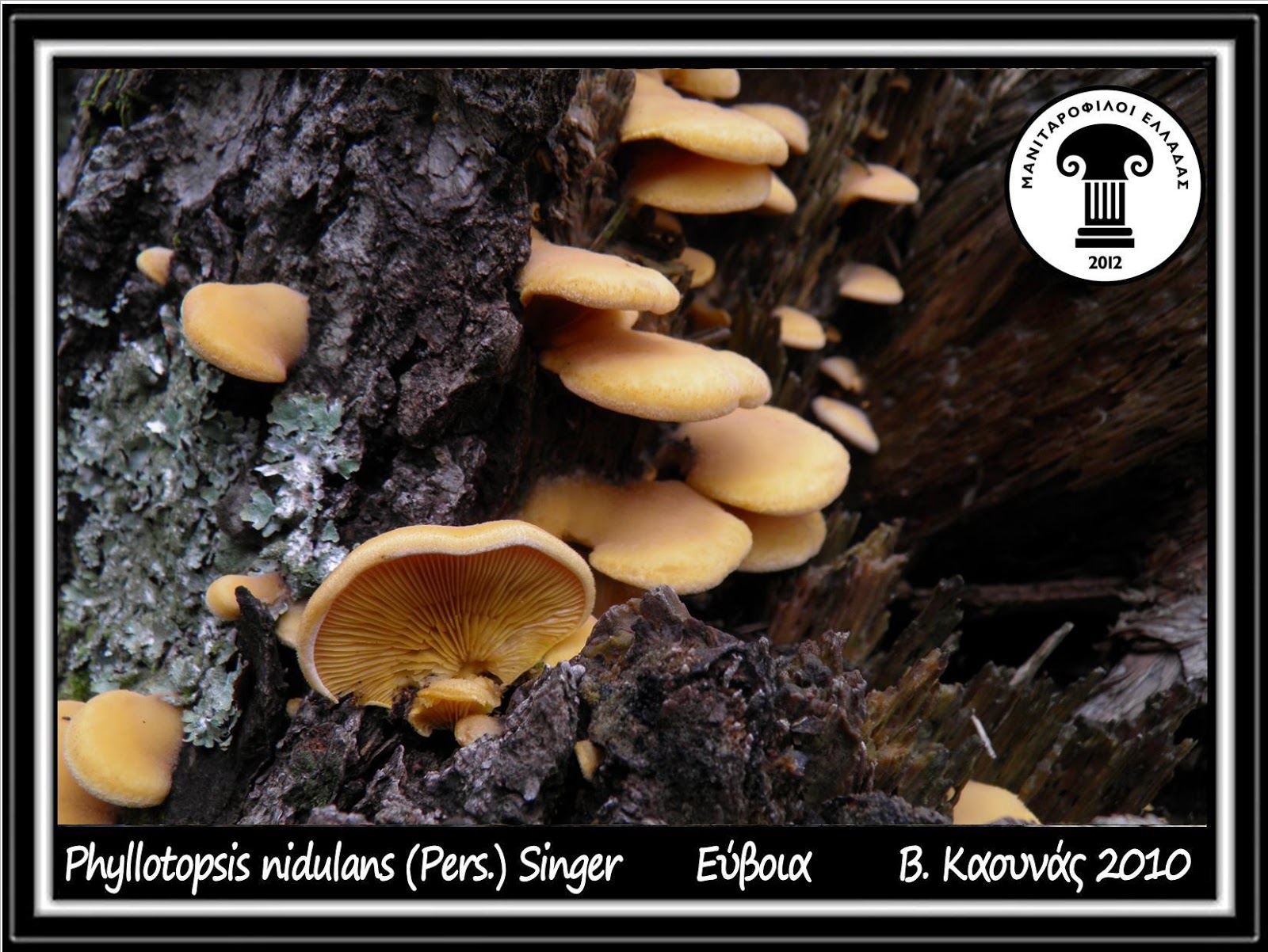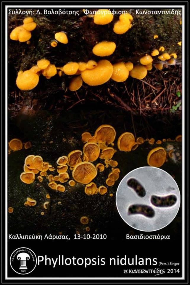 Το μάλλον ασυνήθιστο, μη εδώδιμο Phyllotopsis nidulans (Pers.) Singer (RMLIII-N2,138, BK3/393, C5/1551, JM693, Cο153, Bο120, Mο62, Κ3-193, Κ5-130) καρποφορεί σχεδόν όλο το χρόνο, συνήθως όμως καλοκαίρι και φθινόπωρο, κατά ομάδες, συνήθως από αλληλεπικαλυπτόμενα καρποσώματα, σε πρέμνα και κορμούς κωνοφόρων (ιδιαίτερα ελάτης και ερυθρελάτης) και σπανιότερα πλατύφυλλων (ιδιαίτερα τσέρου) και παράγει μέτρια βασιδιώματα με σχεδόν ημικυκλικό, ριπιδιόμορφο, γλωσσοειδές, νεφροειδές ή οστρακόμορφο, κυρτό, πορτοκαλί καπέλο (3-7 x 2-5 εκ.), ελάσματα χωρίς αναστομώσεις και κυματισμούς, μυρωδιά βρασμένου λάχανου, κυλινδρικά ή κάπως κυρτά φασιολόμορφα, λεία, υαλώδη βασιδιοσπόρια ((5) 5,35-6,5 (7) x (1,95) 2,2-2,5 (3,3) μm, RM: (5) 5,4-6,4 (7) x (2,2) 2,3-2,4 (2,5) μm, 5-6,7 x 2-3,3 μm, Κ: 5,35-6,5 x (1,95) 2,05-2,55 (2,7) μm.) χωρίς σταγόνες και κρεμ-ρόδινο σποριοαποτύπωμα. Πηγή: Γιώργου Κωνσταντινίδη: Agaricales – Αγαρικοειδή (αδημοσίευτο αρχείο) — μαζί με Δημήτρη Σωφρόνη