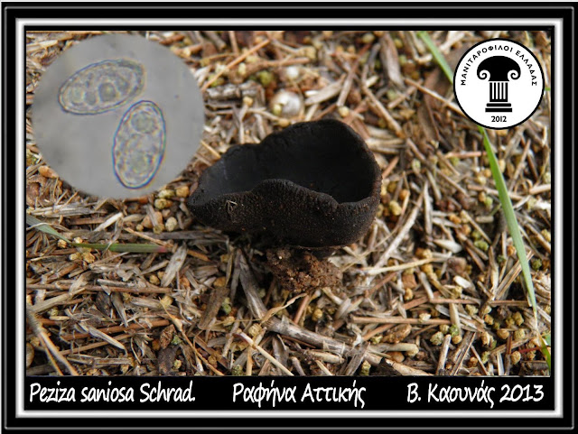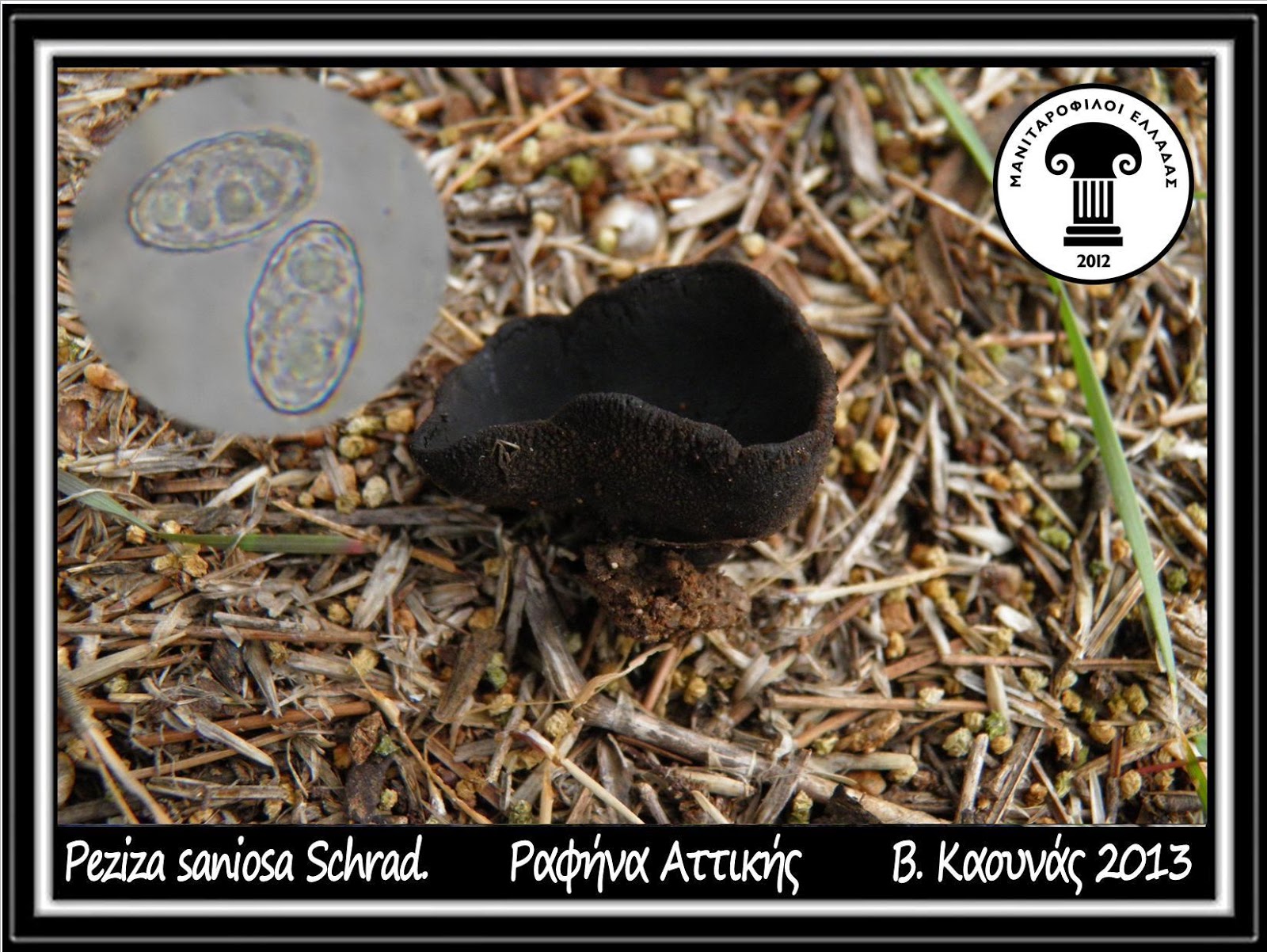 Το Peziza saniosa Schrad. (BΚ1/50, C7/2917, JM1/83, G594, P271, Bu218, ΑΙ204) καρποφορεί από τον Ιούνιο έως τον Οκτώβριο, σπανίως μοναχικά, συνήθως κατά ομάδες, συχνά από πολυάριθμα ασκώματα, σε δάση κωνοφόρων και πλατυφύλλων, σε γυμνό έδαφος, ανάμεσα σε πεσμένα φύλλα, βρύα ή γρασίδι, μερικές φορές και σε νεκρούς κλώνους και παράγει ασκώματα (διάμ. 1-3,5 εκ.), με σχήμα κώνου αρχικά, κυπέλλου ή ακανόνιστης, κυματιστής σουπιέρας που απλώνεται αργότερα, χωρίς μίσχο, με λείο και θαμπό, βαθύχρωμο, με κυανούς, μαυροβιολετιούς και κυανομαυριδερούς τόνους υμένιο, ελαφρώς πιτυρώδη, καφετιά εξωτερική επιφάνεια, ομοιόχρωμη, συνεκτική σάρκα που, αν κοπεί, εκκρίνει χυμό με λιλά ή γαλάζιους τόνους και ελλειπτικά ασκοσπόρια (12,5-16 x 7-9 μm), με εμφανή, τραχιά φύματα και δύο σταγόνες. Πηγή. Pezizales, αδημοσίευτο αρχείο Γιώργου Κωνσταντινίδη.