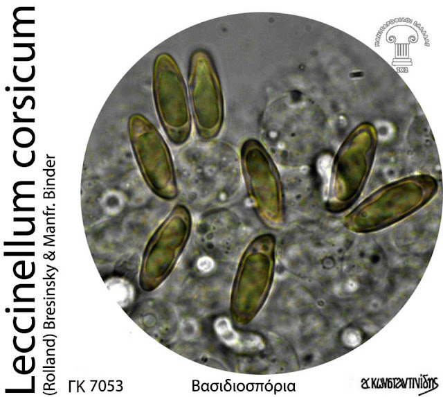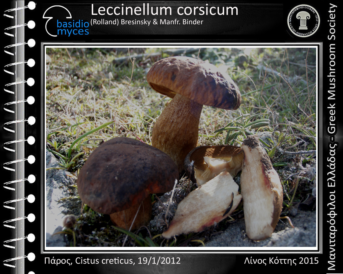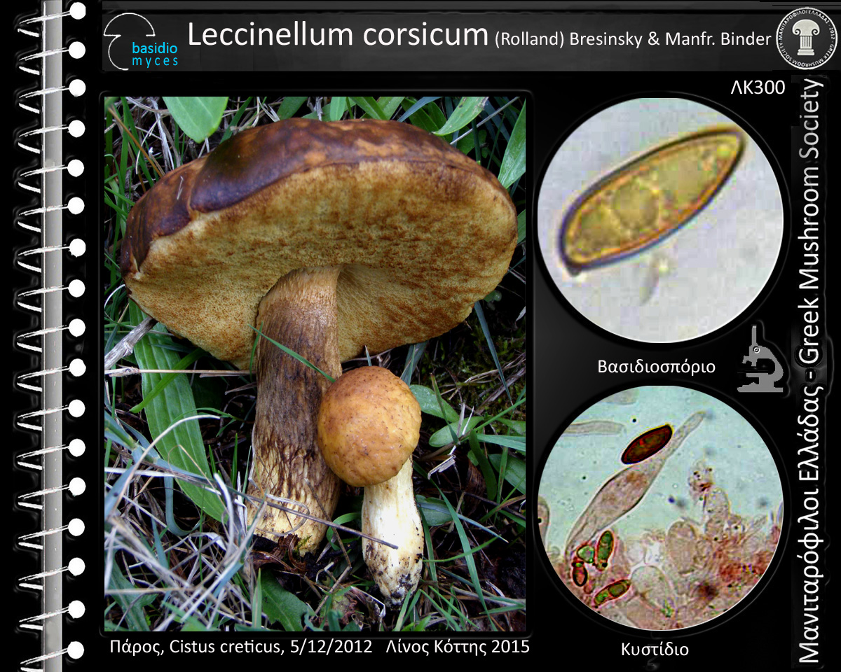 Το ασυνήθιστο, φαγώσιμο χαμηλής ποιότητας Leccinellum corsicum (Rolland) Bresinsky & Manfr. Binder ( = Leccinum crocipodium var. corsicum (Rolland) Bertault) (G/B256, I2/903, C4/1563, D86, Κ5-288, Fu4/8, Co1708 remarques, ΑG42, LE144, manitari.gr) καρποφορεί από τον Νοέμβριο έως τον Φεβρουάριο σε μεσογειακούς θαμνότοπους ανάμεσα σε ιξολαδανιές και -σ.μ.β.- κίστους λαδανιφόρους, κίστους φασκομηλόφυλλους και ηλιάνθεμα και παράγει μικρά έως μέτρια (μεγάλα) βασιδιώματα με ρυτιδωμένο, βελούδινο, κιτρινοκαφετί ή ωχροκαφετί καπέλο (3-5 (9) (12) εκ. διάμ.) που ραγαδιάζει σε ξερό καιρό, κιτρινωπούς πόρους που καφετίζουν στο άγγιγμα, λευκοκιτρινωπή σάρκα που αρχικά ροδοκοκκινίζει στο κόψιμο και αργότερα γίνεται ρόδινη-βιολετιά και τελικά ωχρογκριζωπή, κίτρινο πόδι (4-6 (8) 1-3 εκ.) και ατρακτόμορφα βασιδιοσπόρια ((12) 14-18 (22) x 5,5-7 (8) μm, Κ: 14,6-21,65 x 5,5-6,9 μm) με Q=2,5-2,6.