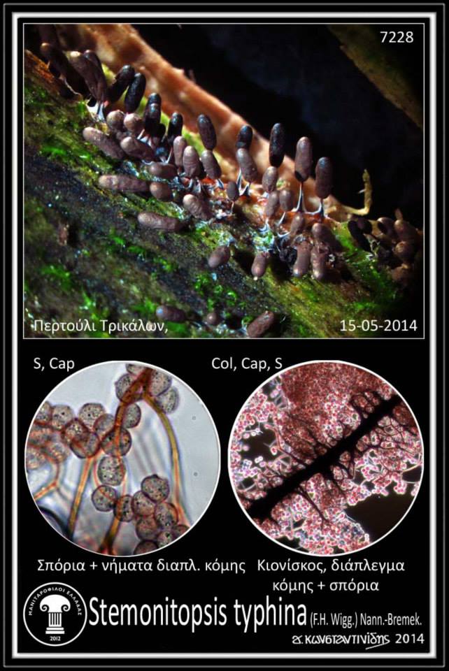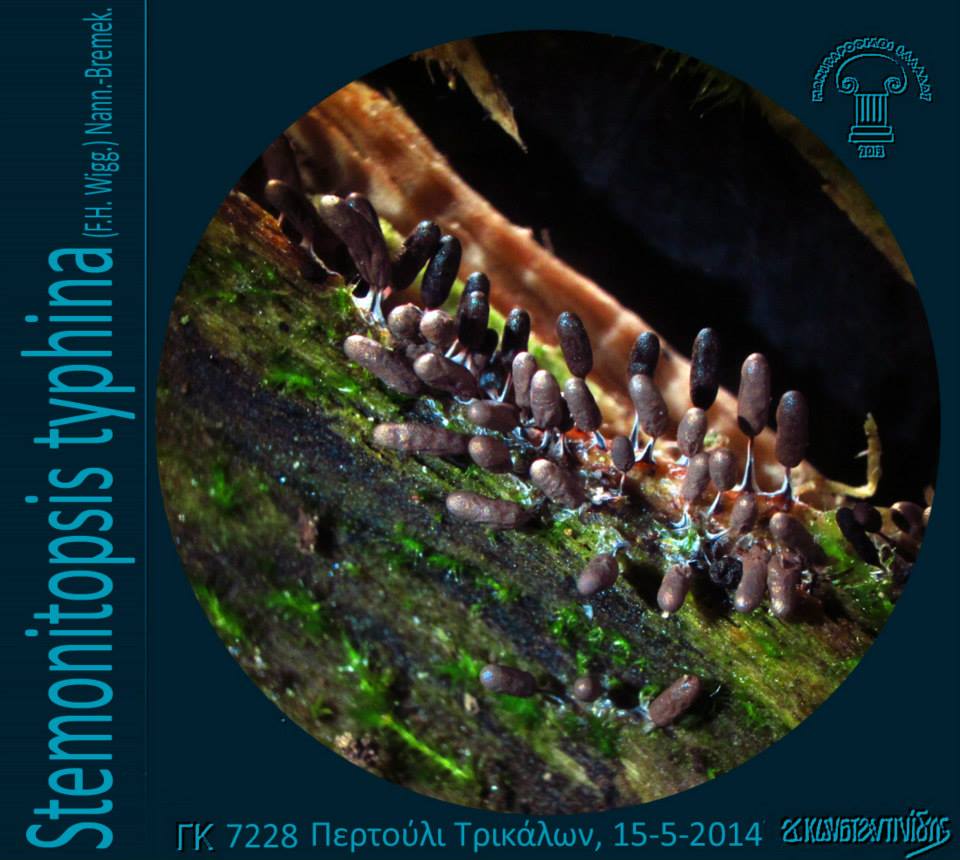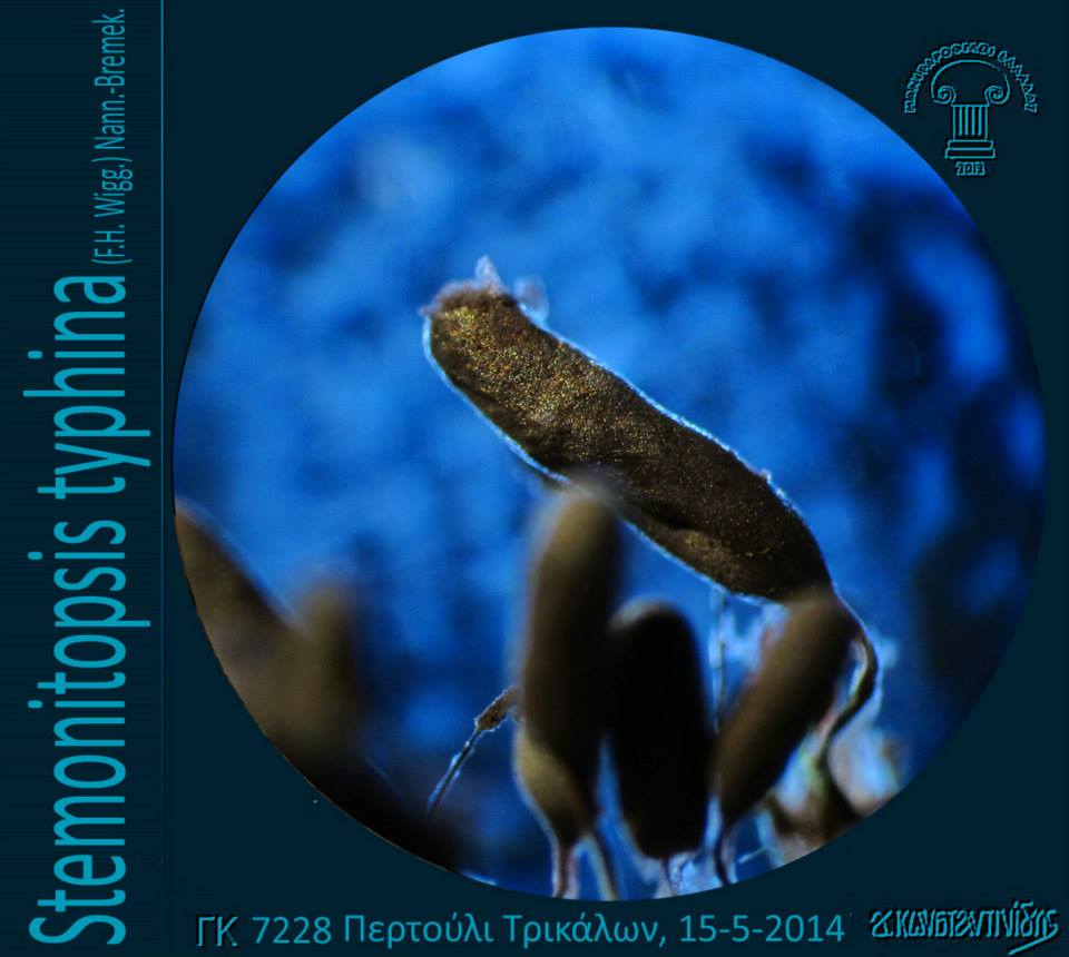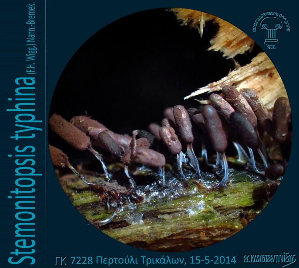 Το Stemonitopsis typhina (F.H. Wigg.) Nann.-Bremek. (=Comatricha typhina (Roth) Rostaf., Comatricha typhina var. heterospora Rex, Comatricha typhoides (Bull.) Rostaf., Comatricha typhoides var. genuina Rostaf., Comatricha typhoides var. heterospora (Rex) Lister, Stemonitis typhina F.H. Wigg., Stemonitis typhina Schumach., Stemonitis typhoides (Bull.) DC., Stemonitopsis typhoides (Bull.) T.N. Lakh. & Mukerji, Trichia typhoides Bull.) (C6/2578, SS98, uoguelph.ca, hiddenforest.co.nz, MdE84, myx.dk, discoverlife.org, ΒΙ213, mycodb.fr, myxo.be, journals.tubitak.gov.tr, manitari.gr) καρποφορεί συνήθως κατά μικρές ή μεγάλες ομάδες, σπανίως σποραδικά, συνήθως σε πολύ σάπιο ξύλο, συνήθως πλατυφύλλων και σπανίως σε φλούδα δέντρων και παράγει πάρα πολύ μικρά, έμμισχα σποροκάρπια που θυμίζουν μικρογραφία βούρλου (Typha latifolia) με κυλινδρικό ή αβγόμορφο σποριάγγειο (2-4 x 0,3-0,4 χιλ.) με λευκωπό-υδαρές πλασμώδιο, αρκετά επίμονο (πρόσκαιρο στο Stemonitopsis typhina var. similis) γκριζοβιολετί, ιριδίζον πηρίδιο με μεταλλική ασημένια λάμψη, που αργότερα σπάζει ακανόνιστα σε πλάκες και τελικά εξαφανίζεται πλήρως ή τμήμα του παραμένει στη βάση ως καλυκόμορφη θήκη, βαθύχρωμο καφετί διάπλεγμα κόμης από λεπτά, μερικές φορές ελικοειδή νήματα με ελάχιστες ακίδες, με 3-4 κυψέλες ανάμεσα στον κιονίσκο και την περιφέρεια, μικρό, βαθύχρωμο κόκκινο ή μαύρο, μερικές φορές με ασημενιο μεμβρανώδες περίβλημα (λείπει στο Stemonitopsis typhina var. similis) πόδι (0,5-2,5 χιλ.), λεπτό, διακλαδιζόμενο κιονίσκο που σχηματίζει δίχτυ, κοινό για την ομάδα, μεμβρανώδη, κοκκινοκαφετί υπόθαλλο και ανοιχτόχρωμα καφεβιολετιά ή γκριζωπά σπόρια (6-7 (8) μm, Κ (1369): (6) 6,8 7,7 μm), Κ (7228): 6,4-8,05 x 6-7,8) μm) με ανοιχτόχρωμα στίγματα και μερικά συναθροιζόμενα κατά ομάδες μεγαλύτερα φύματα. Πηγή: Γιώργου Κωνσταντινίδη: Μυξομύκητες (αδημοσίευτο αρχείο)