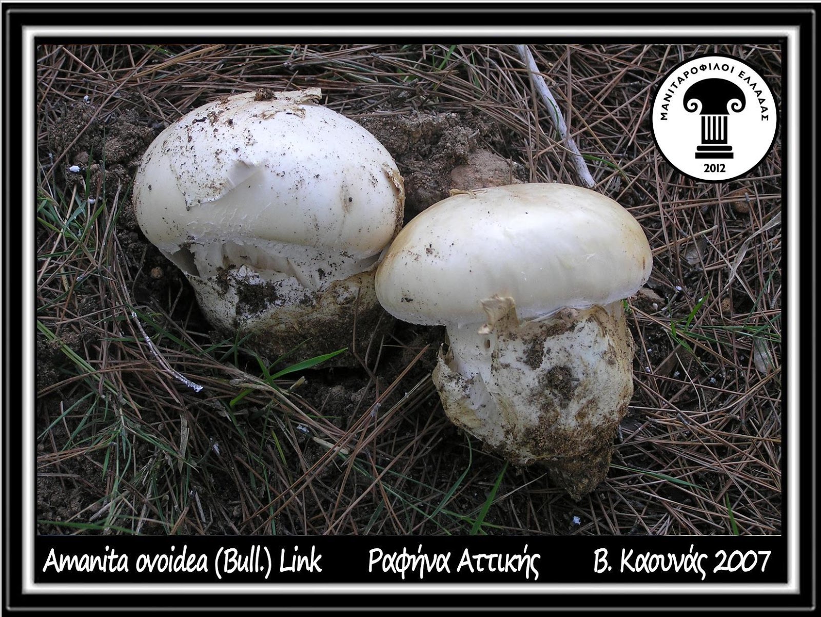 Το συνηθισμένο, τοξικό Amanita ovoidea (Bull.) Link (Α630, C1/10, M2/103, JM1471, Co848, D469, Bo298, Δ84, LP163, Ma2, T106, Π4, Fu3/b18, Mo227, Κ5-005, Uz294, FΙ-45, manitari.gr) καρποφορεί από τον Αύγουστο έως τον Ιανουάριο, μοναχικά ή κατά μικρές ομάδες, σε δάση πλατυφύλλων (χνουδωτής δρυός, αριάς, φελλόδρυος), κωνοφόρων (χαλέπιο πεύκο, κουκουναριά, κυπαρίσσι) ή σε θαμνότοπους (ανάμεσα σε λαδανιφόρους κίστους), σε ασβεστώδη εδάφη και παράγει ογκώδη, μεγάλα έως πολύ μεγάλα βασιδιώματα με συνήθως λείο, χωρίς υπολείμματα του πέπλου, λευκό ή κρεμ καπέλο (διάμ. (7) 10-20 (35) εκ.) με πλεονάζουσα περίμετρο και κρεμώδη υπολείμματα του πέπλου να κρέμονται από αυτή, λευκωπά ελάσματα με ρόδινες ανταύγειες, πλατύ αλλά εύθραυστο, κρεμώδες, εξαιρετικά εύθραυστο και πρόσκαιρο δαχτυλίδι, λευκωπά ελάσματα, μεγάλη λευκωπή, ωχροκρέμ ή ωχροκαφετιά θήκη στη βάση του ποδιού, μυρωδιά που θυμίζει ρεπάνι, ψαρίλα ή αλεύρι, ήπια γεύση και ελλειπτικά, λεία, υαλώδη, αμυλώδη βασιδιοσπόρια ((7) 10-11 (13) x (5) 5,5-7 (8,5) μm ). Πηγή: Γιώργου Κωνσταντινίδη: Agaricales – Αγαρικοειδή (αδημοσίευτο αρχείο) * Στην εργασία: Biagi, M., Martelli, L., Perini, C., Di Lella, L., Miraldi, E. (2014). Investigations into Amanita ovoidea (Bull.) Link.: Edible or Poisonous? Natural Resources, 2014, 5, 225-232. Published Online, αποδείχθηκε πως σύμφωνα με πρόσφατες χημικές αναλύσεις που πραγματοποιήθηκαν σε Α. ovoidea, αναφέρεται η παρουσία πολυφαινόλων και πολυσακχαριτών, μαζί με στερόλη και triterpene γλυκοζίτων καθώς και χαμηλά επίπεδα αλλενικής νορλευκίνης, της ίδιας, δυνητικά θανατηφόρας νεφροτοξίνης που είναι παρούσα στην Α. proxima. Ως εκ τούτου οι συντάκτες αυτής της μελέτης συμβουλεύουν να μην γίνεται η κατανάλωση αυτού του μανιταριού. Πηγή: Γιώργου Κωνσταντινίδη: Agaricales – Αγαρικοειδή (αδημοσίευτο αρχείο)μαζί με Georgios Karamichailidis